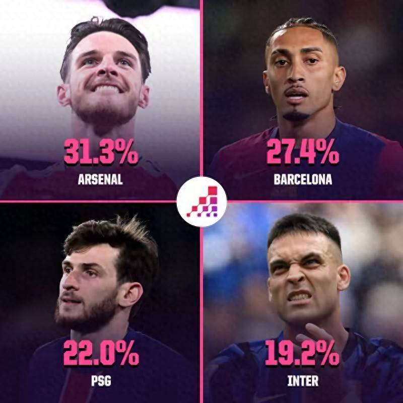 阿森纳:31.3%。巴萨:27.4%。巴黎:22.0%。国际米兰:19.2%。欧冠半决赛对阵: