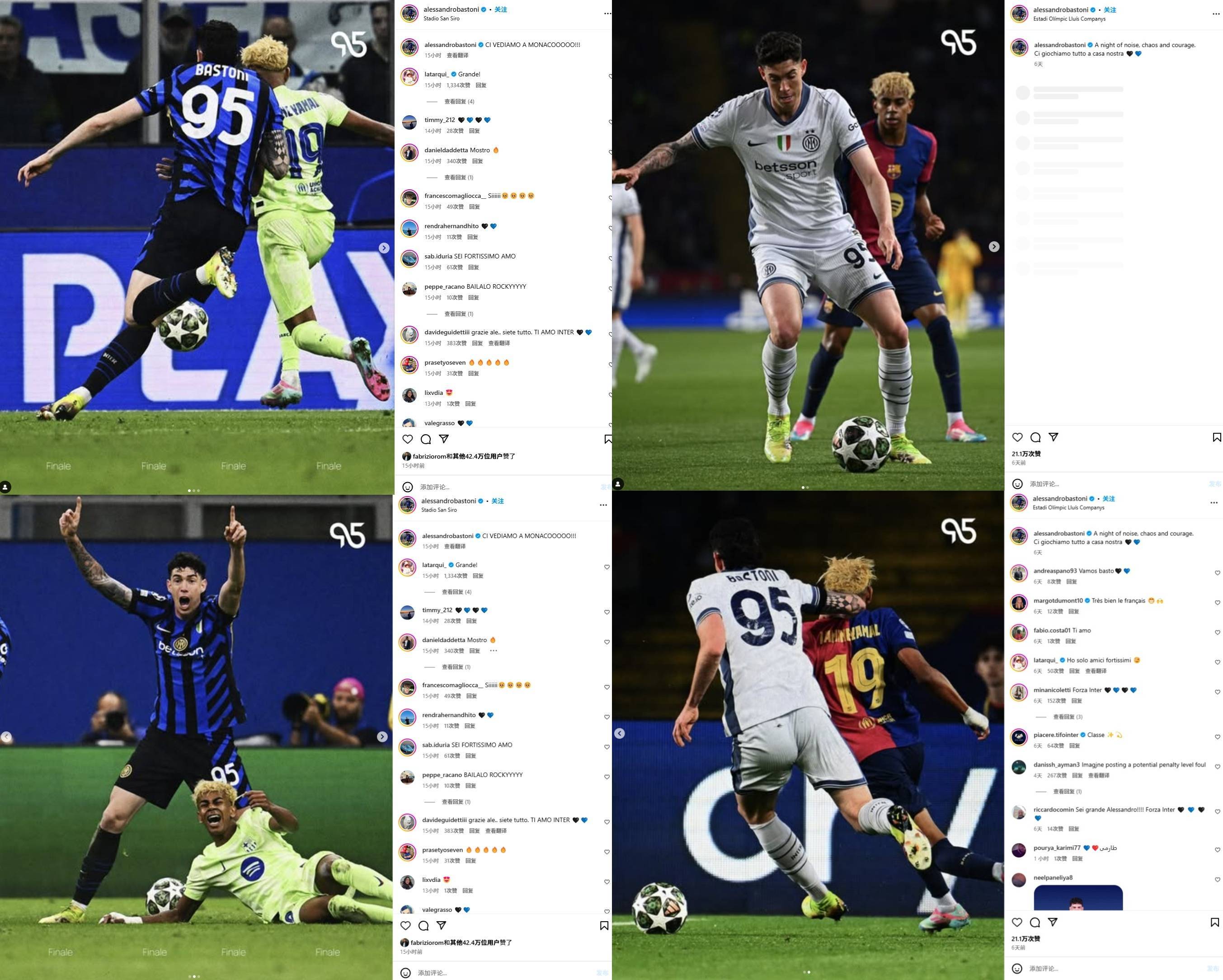值得一提的是,在首回合比赛结束后,巴斯托尼发布动态的两张配图也是自己和亚马尔的同框照。