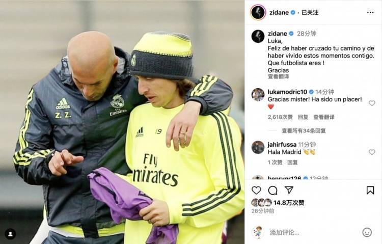 莫德里奇在该社媒动态下回复:“谢谢教练,这是我的荣幸♥️”